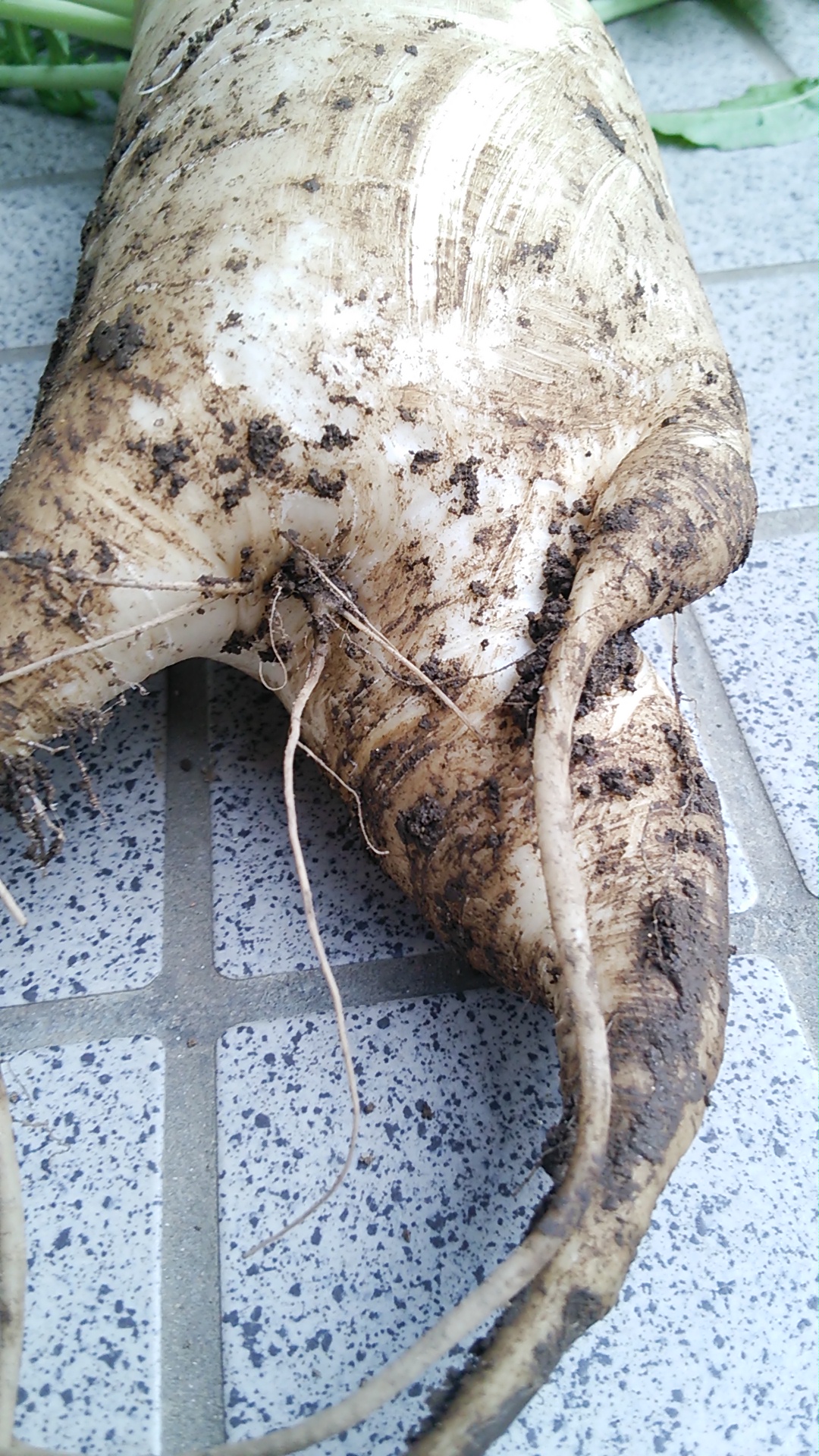 それでも、なんとか 大根特有?の かるくプチプチッと根が切れる感触後ヌルッっと収穫完了。