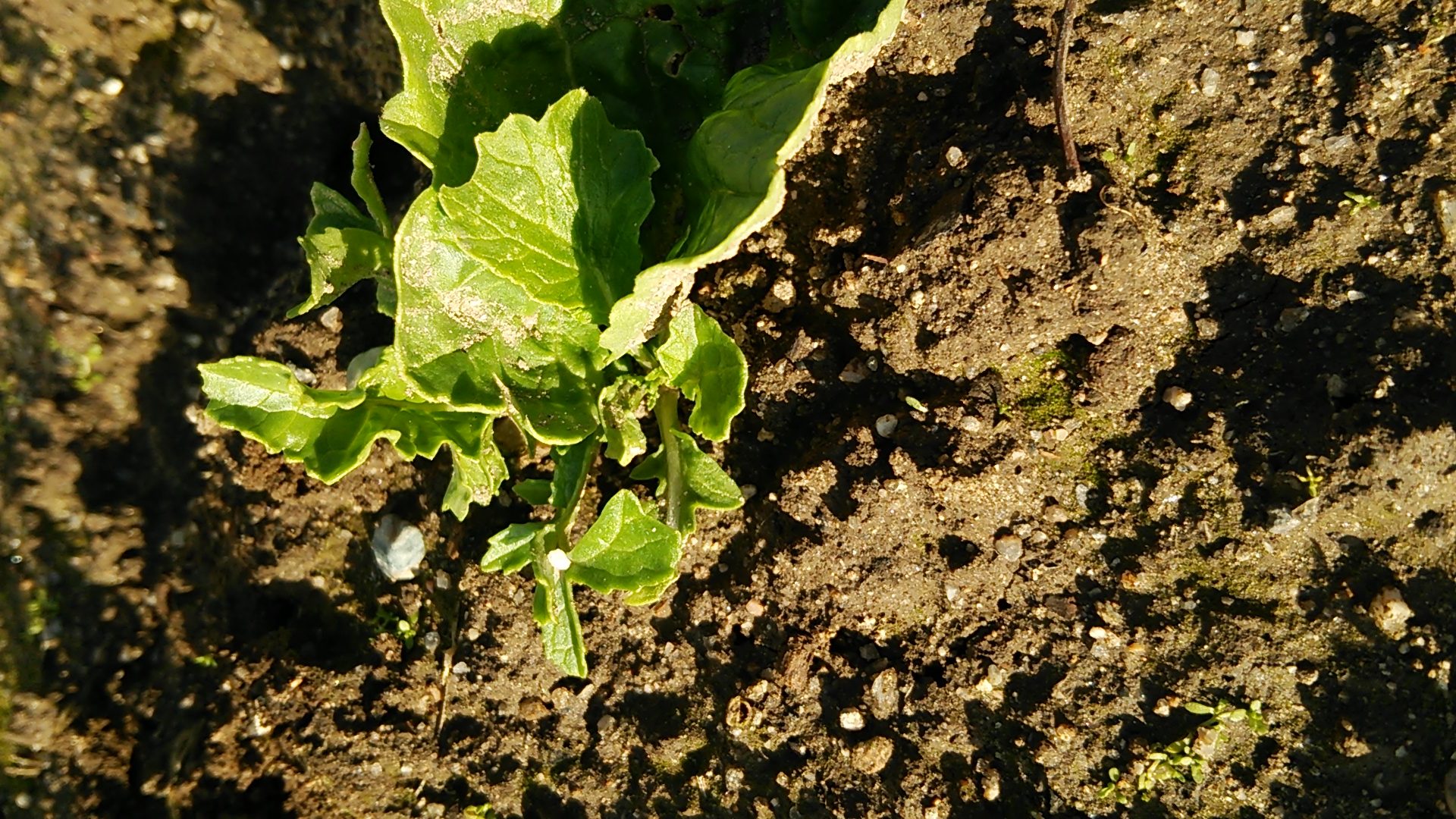 と、大変な境遇に遭っている【2番】の大根から、葉が再生してきてた!!