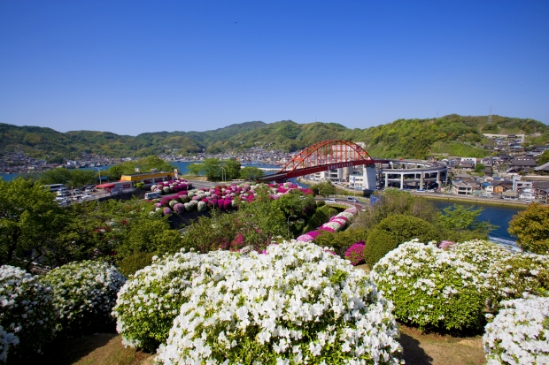 3月~5月頃、真っ赤なアーチ橋と桜やツツジとの景観が美しい。