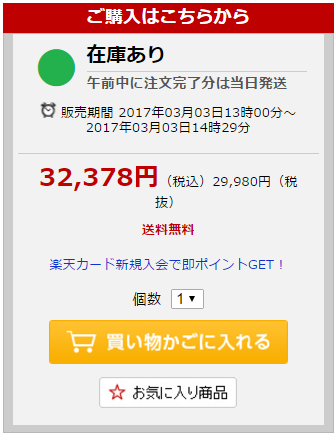 13:00からしばらくは在庫あったようですが、13:44に確認した時には「ご注文できない商品」 になってました。