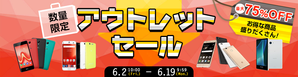 6月2日 10:00 ~ 6月19日 9:59 の期間限定にて、スマートフォン本体のアウトレットセールが開催中。