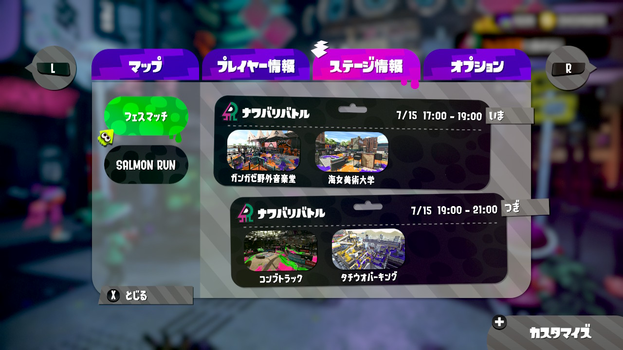 「前夜祭」のフェスマッチ。ゲームルールは、「ナワバリバトル」なので3月に行われた試射会(【初見プレイ】スプラトゥーン2 先行試射会の感想)と基本ルールは同じ。