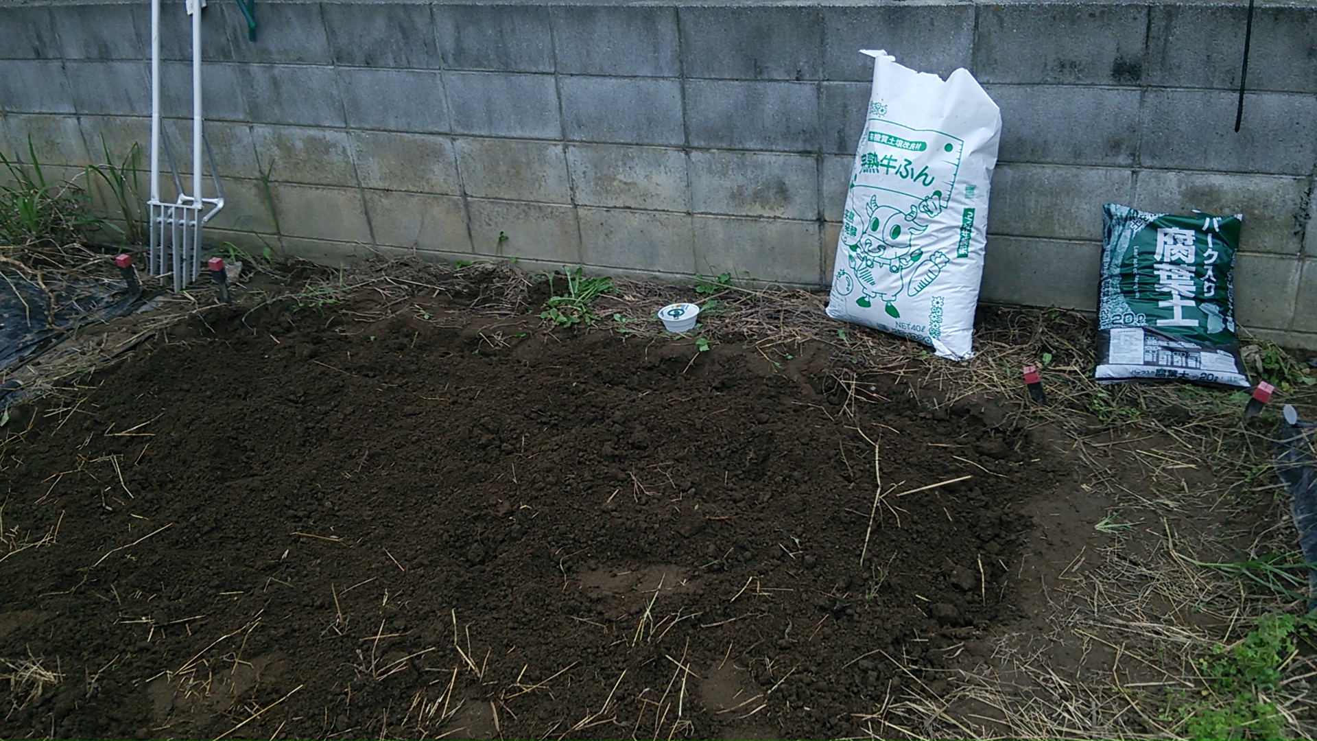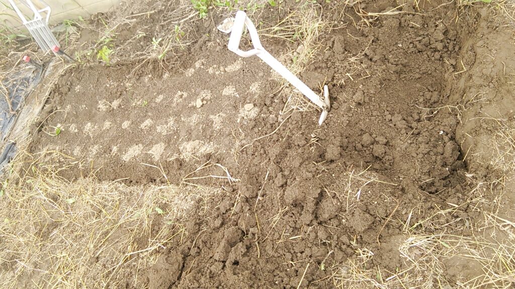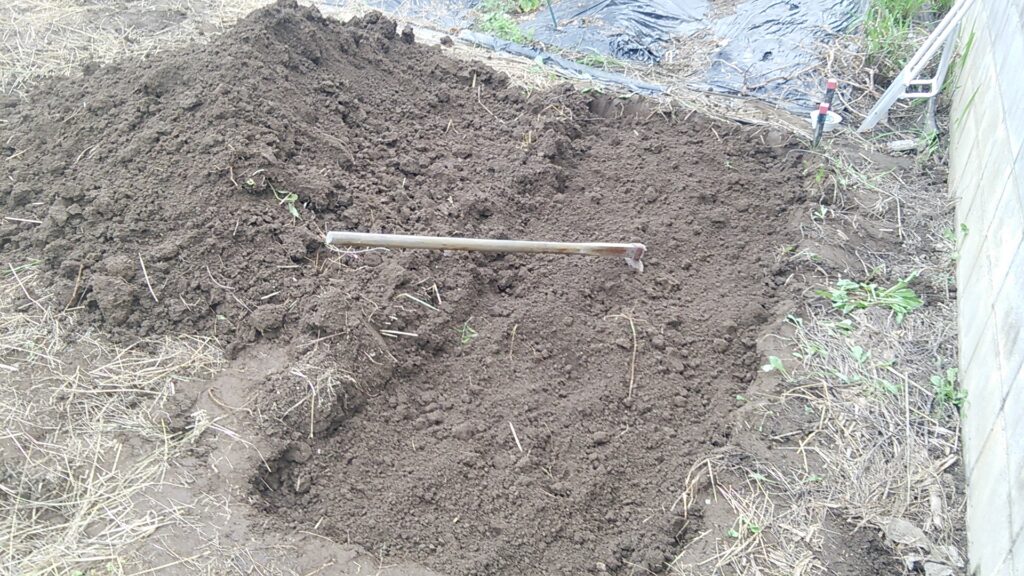 掘り返して耕したら、「牛糞堆肥」と「腐葉土」を混ぜ込みます。