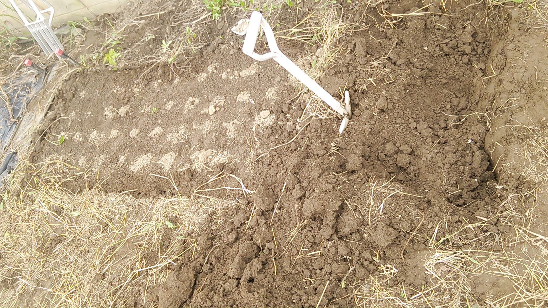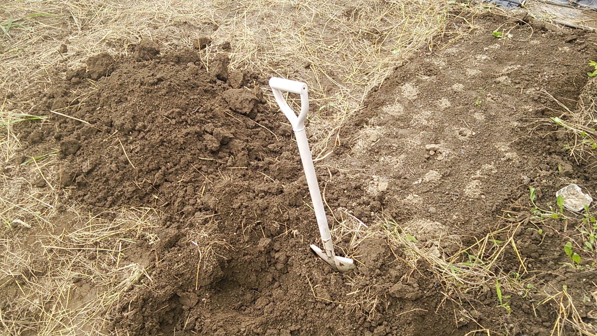 4ヶ月くらい放置してたので、シャベル(スコップ)でしっかり下の方まで掘り返します。
