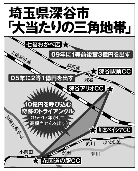 2008年に年末ジャンボで花園道の駅CCと深谷アリオCCで1等前後賞3億円が出ると、2009年の年末で「七福おかべ店」から1等前後賞3億円が飛び出した。