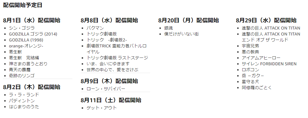amazonプライム会員なら、無料で見られる動画ですが 8月配信予定一覧 が、amazonプライムビデオの公式ページにて公表されています。