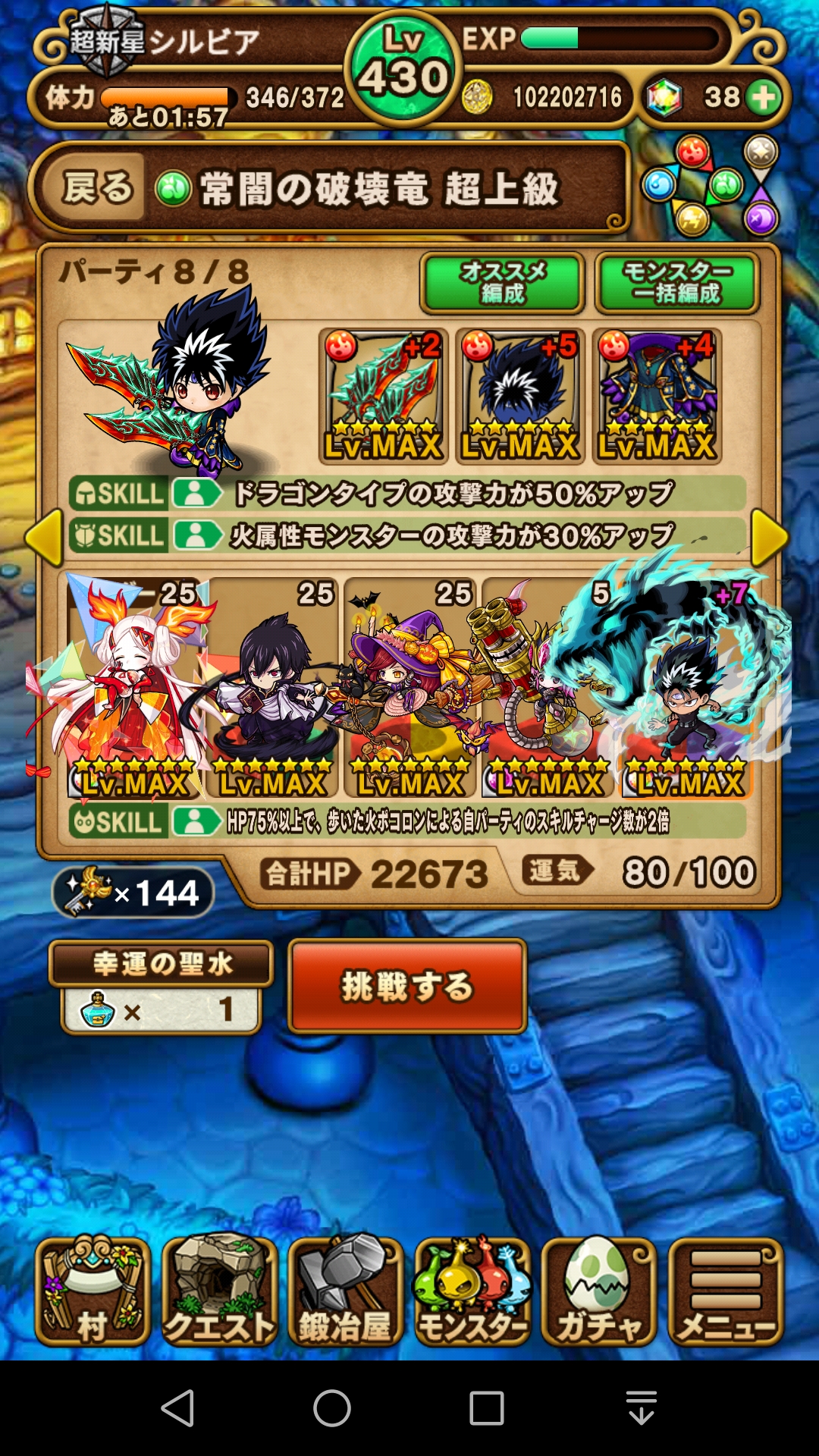 飛影をフレンドに借りて、ドラゴンタイプと火属性の攻撃力アップ装備。