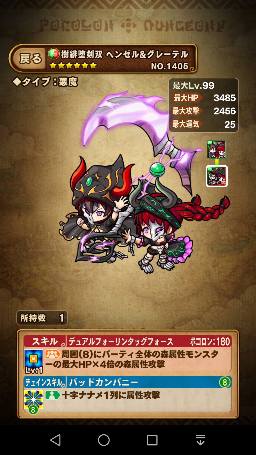 特に、『堕剣双 ヘンゼル&グレーテル』は攻撃範囲が狭い割に 結構スキルダメージを与えられるので、森運25パーティーで大活躍中。