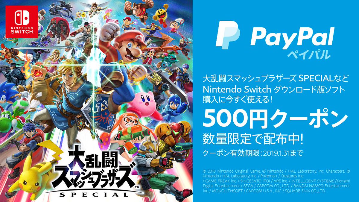 【数量限定クーポン!】『大乱闘スマッシュブラザーズ SPECIAL』など Nintendo Switch ダウンロード版ソフトの購入に今すぐ使える! #ペイパル 決済「500円クーポン」を数量限定で配布中! #スマブラSP