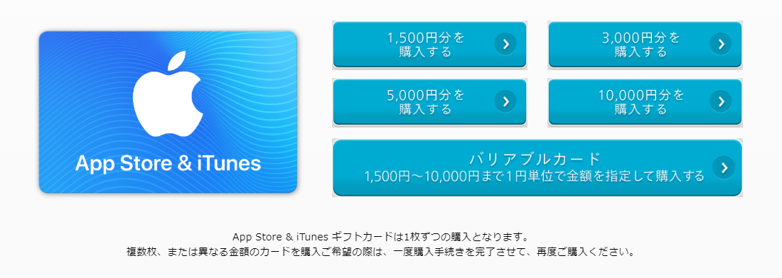 『App Store & iTunes ギフトカードは1枚ずつの購入となります。』