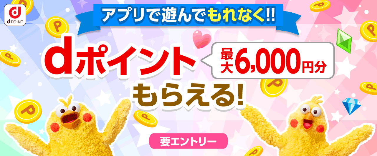⇒ アプリで遊んでもれなく!!dポイント最大6,000円分貰えるキャンペーン
