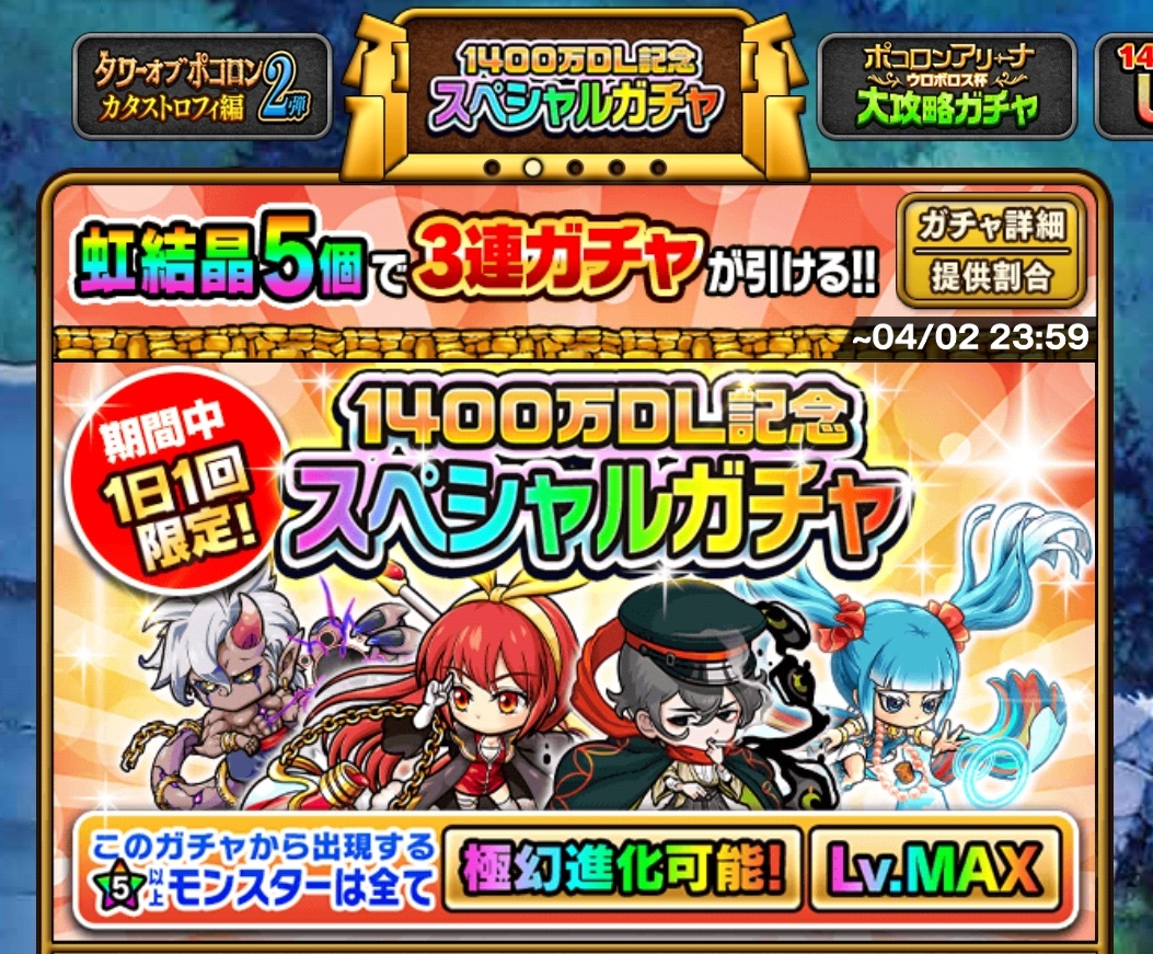 ポコロンダンジョンズ」のダウンロード数1400万突破を記念して、虹結晶5個3連ガチャが引ける期間中1日1回限定の特別なガチャを開催!