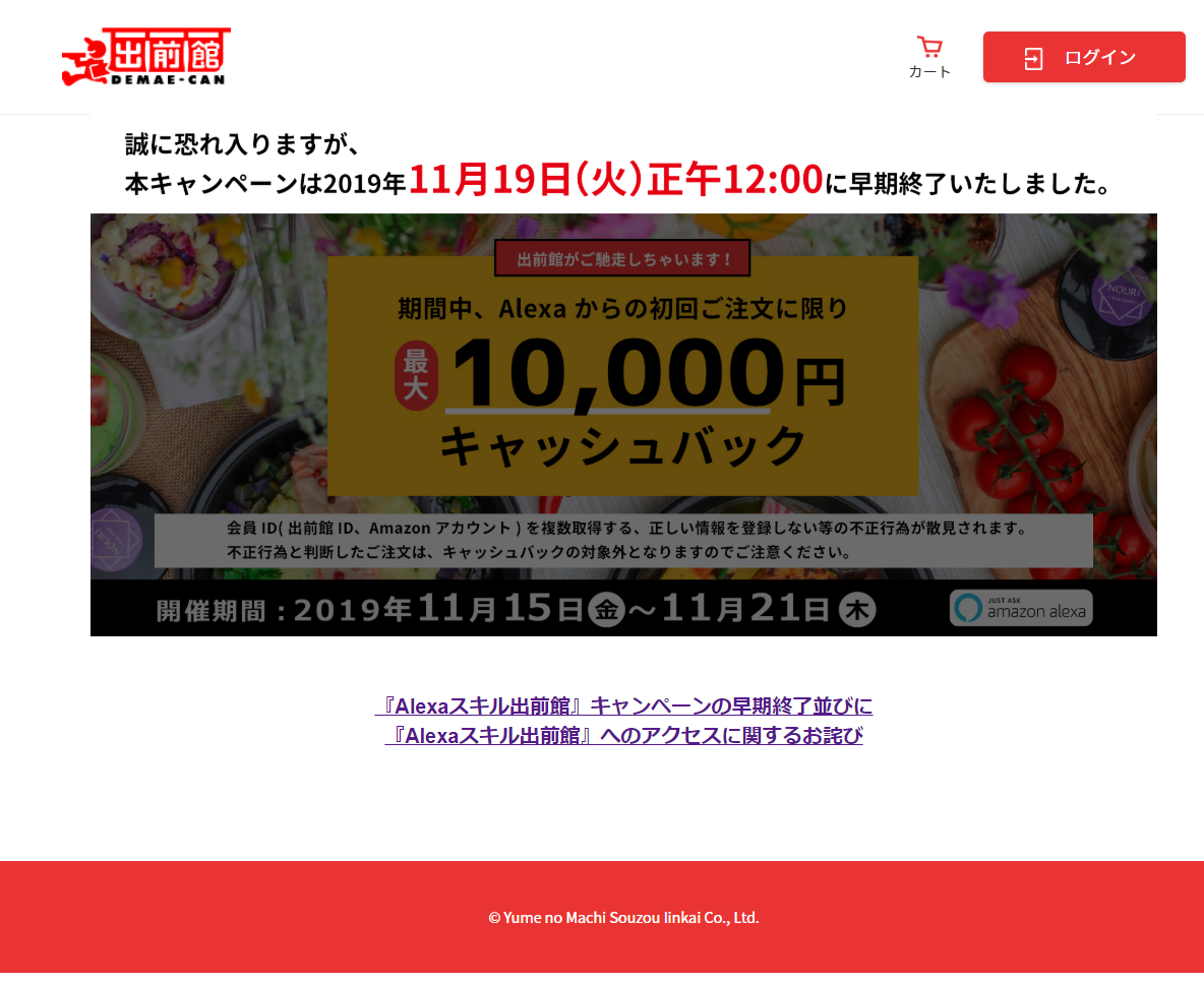 当社が運営する宅配ポータルサイト『出前館』では、2019 年11月15日(金)より、「期間中、Alexaスキル出前館での初回注文に限り、最大1万円までキャッシュバック!」キャンペーンを実施しておりましたが、当初の予想を上回るご注文をいただいたため、誠に恐れ入りますが11月19日(火)正午に終了いたします。
