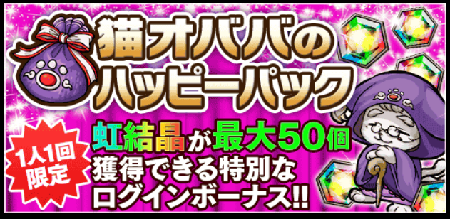 「猫オババのハッピーパック」は 600円で虹結晶50個獲得 できるという、