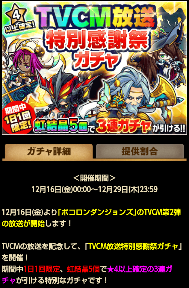 2016年12月16日~12月29日 の日程で、お得なガチャが始まったので毎日の結果をまとめておきたいと思います。